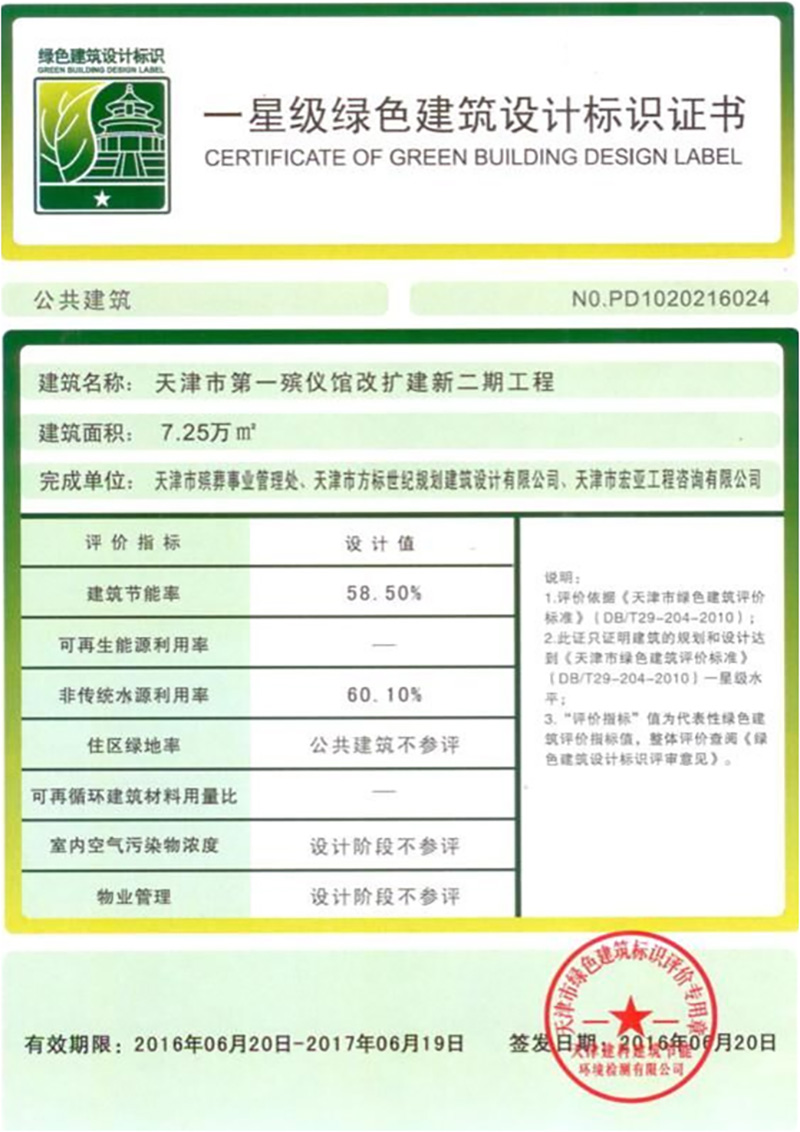 坐落在天津市北辰區鐵東路(第一殯儀館院內)。總投資約3.6億元,總建筑面積7.3萬平米,地上兩層,地下一層,其中:地上5.3萬平米,地下2萬平米,框架結構,屬于天津市民心工程。該項目于2016年6月通過專家會評審,獲得國家一星級綠色建筑設計標識。