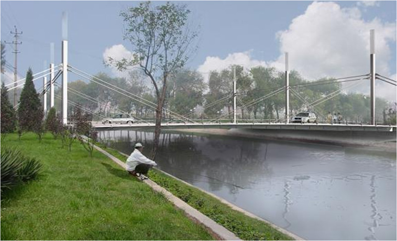 全長46.726米,寬39 米,總投資3008萬元,該工程的主體部分為空間體系小跨徑多塔斜拉橋,橋塔為圓形鋼管混凝土結構、塔前、背索及塔間索的錨固端與橋塔相連。