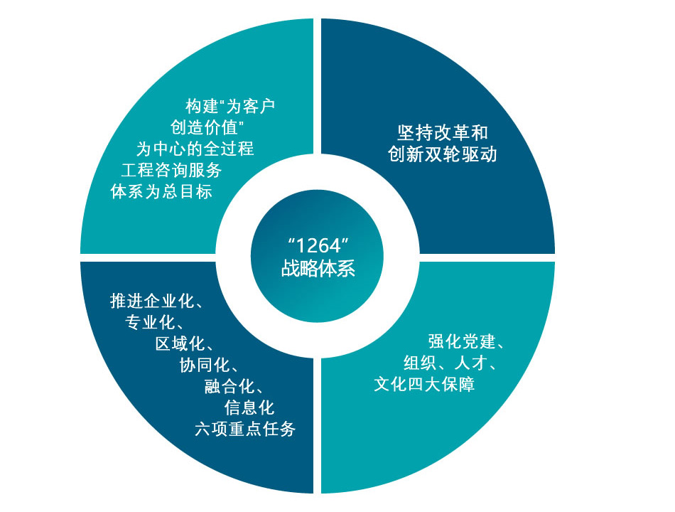 以習近平新時代中國特色社會主義思想為指導,緊緊把握新發展格局歷史機遇,堅定不移貫徹新發展理念,以推動高質量發展為主題,以市場需求為導向,全力實施“1264”戰略體系,即以構建“為客戶創造價值”為中心的全過程工程咨詢服務體系為總目標,堅持改革和創新雙輪驅動,全面推進企業化、專業化、區域化、協同化、融合化、信息化等六項重點任務,強化黨建、組織、人才、文化四大保障,將天咨公司全力打造成為京津冀區域領先的工程咨詢品牌企業和上海建科集團區域業務發展平臺。